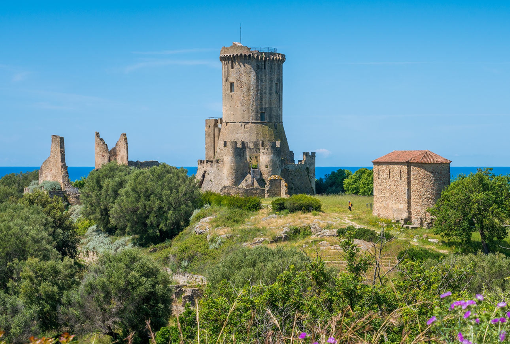 Dall'alto dell'Acropoli del Parco Archeologico di Elea-Velia, ponendosi all'ombra dei grandi ulivi, di fianco al teatro, si adocchia uno dei tratti costieri più belli del Cilento.